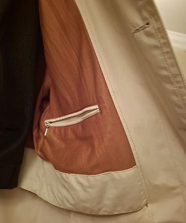 Bej rəngli kişi plaşı/palto - Model: ikisıralı düyməli, klassik trench stilində - Rəng: açıq bej - Bədən ölçüsü: XXL (etiketdə göstərilib) - Material: yüngül, hamar toxumalı parça; iç tərəfi nazik ...