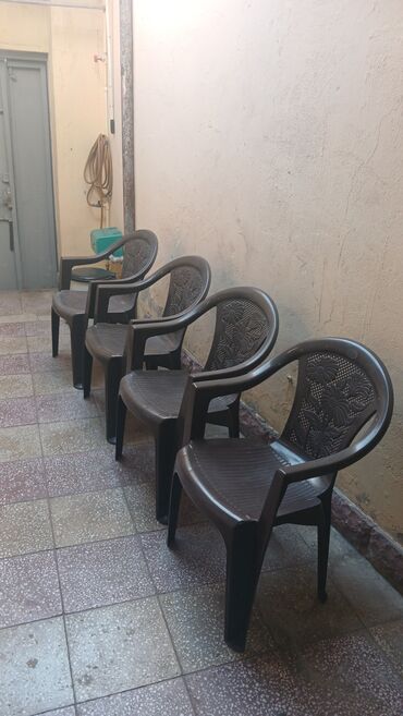 - 4 ədəd eyni model plastik kreslo. Rəng: tünd qəhvəyi. Arxalıq hissəsində çiçək naxışlı ventilyasiya deşikləri, qollu dizayn, möhkəm plastik oturacaq və ayaqlar. Həyətyanı məkan, tədbirlər, balkon və bağ üçün uyğun; yüngül olduğuna görə asan daşınır və yığılır.
