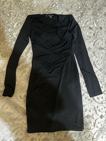 Qara/qrafit atlas parıltılı, birqollu kokteyl/axşam geyimi. - Dizayn: Asimmetrik və bir çiyindən açıq kəsim. Bir qol tərəfdə volan detalı. - Bəzək: Boyun xəttindən başlayıb ön hissə boyunca və ətə...