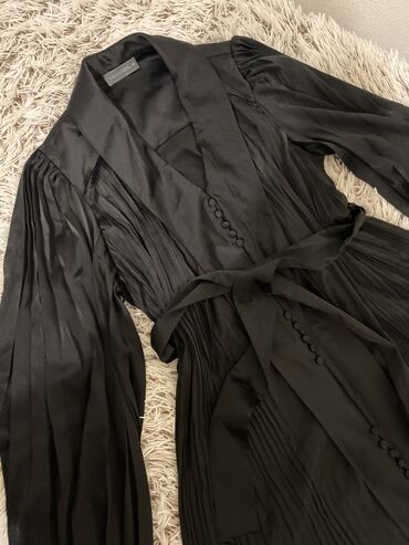 Atlas materialdan, gümüşü-boz rəngdə ziyafət donu. Nazik tənzimlənən askılar, V-yaxa, yan hissədə büzgülü detallar və yandan yüngül açılışlı uzun ətək. M razmer. Mətndə qeyd: 1 dəfə geyinilib. Qiym...