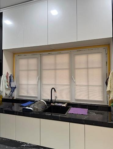 - Mətbəxdə kran üstü üç bölməli pəncərələrdə tam örtü.
