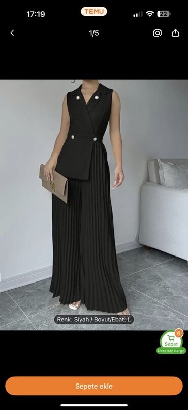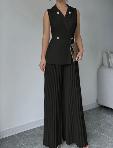 Qara rəngli kombinezon - Model: qısaqol, dairəvi yaxalı - Dizayn: üst hissəsi paltar görünüşlü, alt hissəsi geniş paçalı şalvar; - Material: axıcı, yüngül parça 1 dəfə geyinilib