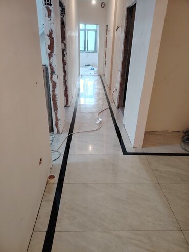 - Daxili koridor və otaqlar üçün parlaq, mərmər naxışlı 60x60/60x120 formatlı plitələrin tam kəsim və bərabər tikişlərlə quraşdırılması