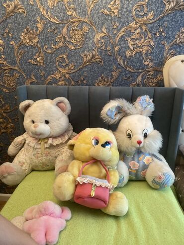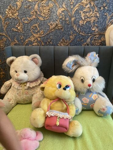 - 3 böyük yumşaq oyuncaq: ayı, dovşan və sarı balaca ayı/balaca heyvan