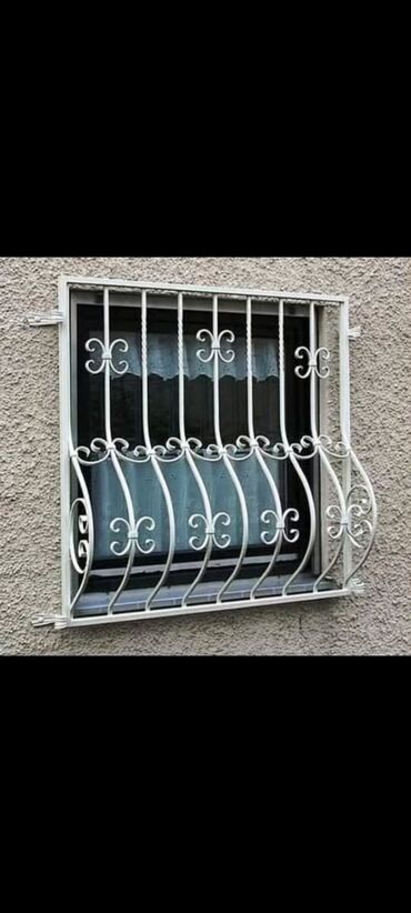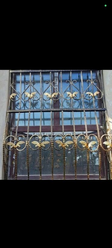 Dəmir pəncərə barmaqlıqları – dekorativ və təhlükəsizlik üçün. - Material: qalın polad profillər və bükülü armatur çubuqlar - Dizayn: klassik naxışlı elementlər, çiçək və qıvrım ornamentlər; bəzi ...