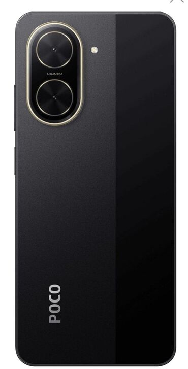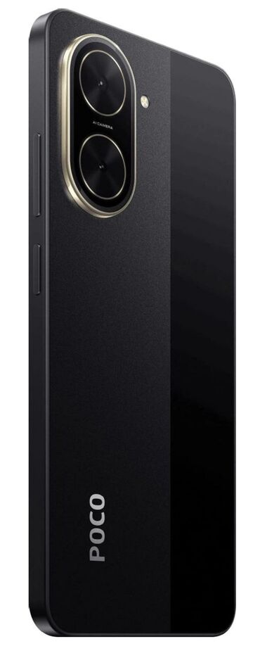 POCO smartfon - Rəng: Qara, mat teksturalı arxa qapaq - Arxa kamera bloku: 2 obyektiv + əlavə sensor/LED modul - Arxa hissədə “POCO” loqosu və “CE” nişanları - Korpus: düz kənarlar, iki böyük dair...