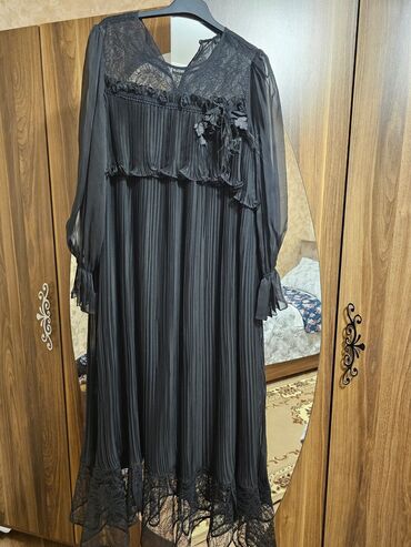 Qara maxi paltar - Rəng: Tam qara - Uzunluq: Maxi (ayağa qədər) - Material: Yüngül şifon/tyul qatları, üst hissədə krujeva naxışlı parça - Yaxa: V formalı - Qol: 3/4 uzunluqda, krujevalı manjet de...