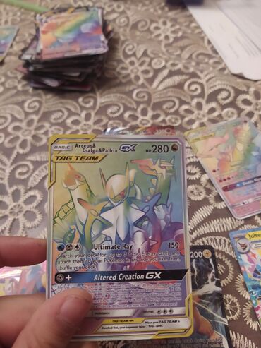 - Arceus & Dialga & Palkia GX – TAG TEAM (HP 280). Hücumlar: Ultimate Ray (150; deste içindən 3 basic Energy axtarıb istədiyiniz formada Pokémonlarınıza qoşa bilərsiniz), Altered Creation GX (oyunun qalan hissəsi üçün ziyan artımı və əlavə Prize kartı effekti; kartdakı mətnə uyğun).