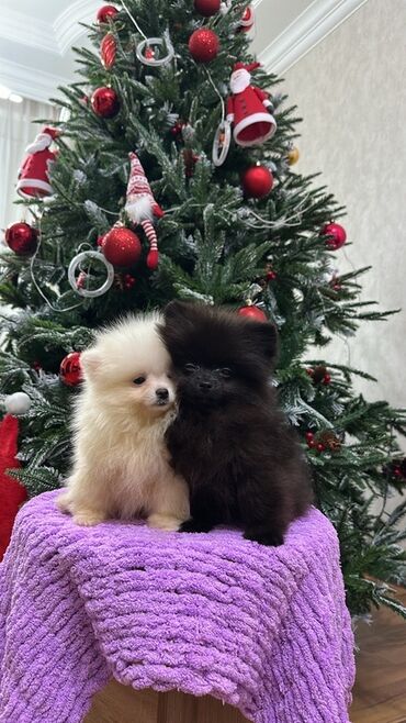 Ağ, tüklü balaca Spitz/Pomeranian tipli iki balaca it balası. Xüsusiyyətlər: - Rəng: krem-ağ - Çox sıx, yumşaq ikiqat yun örtüyü - Kiçik gövdə quruluşu, qısa pəncələr, tünd gözlər - Qısa, tüklü qu...