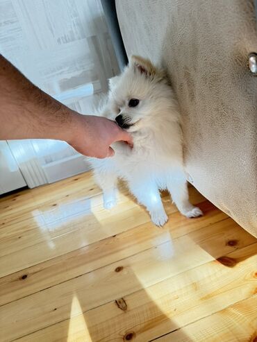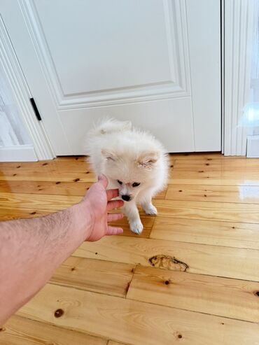 Pomeranian (Spitz) balası – ağ rəngli, tüklü və kompakt ölçülü.