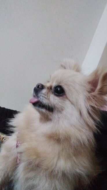 Pomeranian (Spitz) balası – kiçik ölçülü, yığcam və çox şirin tüklü it. Şəkillərdə görünən it: - Rəng: krem–şaftalı qarışıq, ağ quyruq tükləri ilə - Xəz: qalın, yumşaq, bol yalı və tüklü quyruq - ...