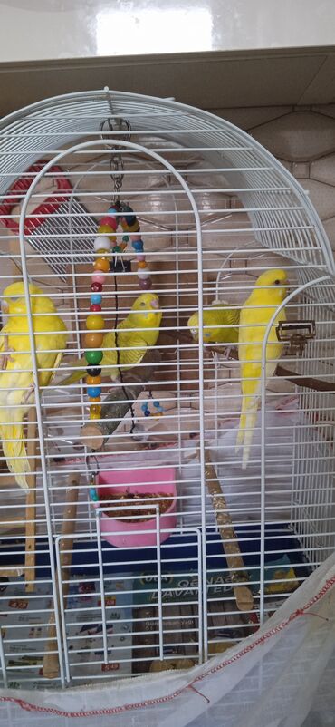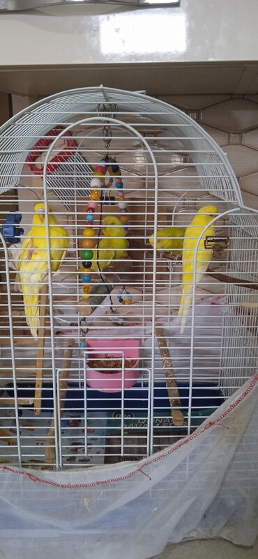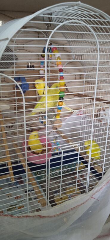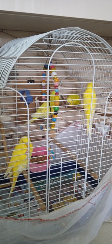Başlıq: Papuqaylar satılır – qəfəs qarışıq, yanında yem də verilir Təsvir: - Nymfa (korella) papuqayları qəfəsdə birlikdə. - Qəfəs və aksesuarları (oturacaq budaqlar, yem qabı) daxil. - Yanında ye...