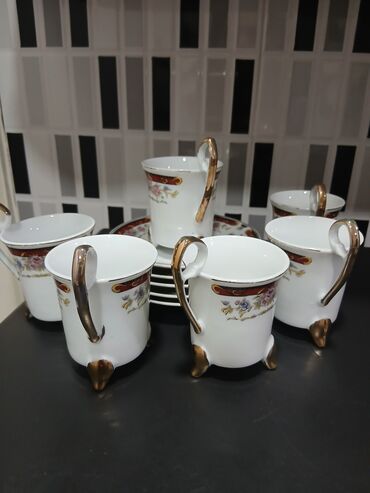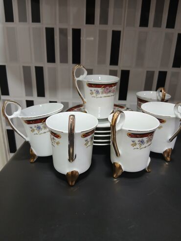 - Detallar: qızılı rəngli tutacaqlar və üçayaqlı qızılı ayaqcığa sahib fincanlar
