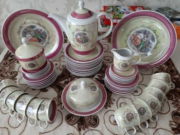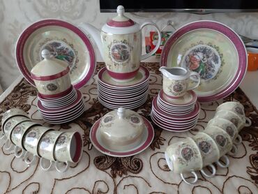 - Tam servis dəsti: böyük çaydan/qəhvədan qapaqlı, süd qabı, qənd qabı (qapaqlı), iki iri boşqab/podnos tipli qab, iki qapaqlı yağ/pendir qabı, fincan və nəlbəki komplektləri.