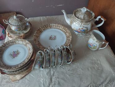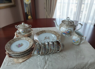 Zərif naxışlı, qızılı haşiyəli porselen çay-servis dəsti. “farfor” alman dı 60+ ilin servizidir! Dəst tərkibi (şəkillərə əsasən): - qapaqlı böyük çaydan - qapaqlı şəkər qabı - qapaqlı mürəbbə/konf...