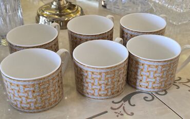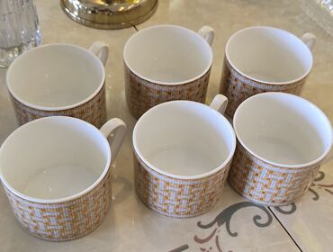 - 6 ədəd tutacaqlı fincan: ağ porselen, kənarında qızılı-narıncı və ağ mozaika naxışlı hörgü dizaynı. Dairəvi forma, qalın kənar, rahat qulp.
