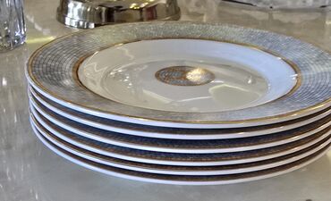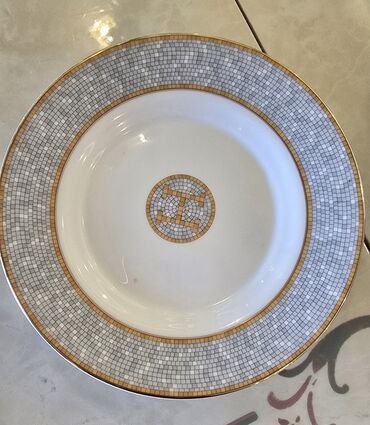 - 6 ədəd dərin boşqab: ağ porselen, kənarı boz-qızılı mozaika halqası ilə bəzədilmiş, mərkəzdə eyni üslubda “H” monoqramlı element. Kənarlarda incə qızılı haşiyə.