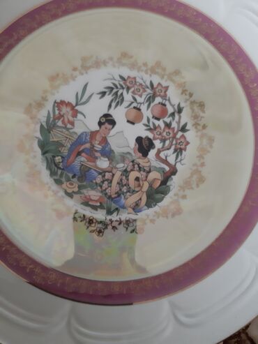 - Rəng və naxış: krem fon, tünd qırmızı halqa və qızılı tonlarda klassik süjetli medalyon rəsmlər