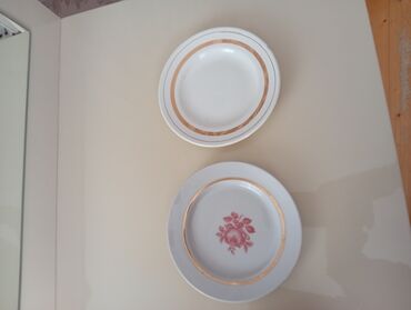 - Qızılı cizgili klassik boşqablar (birində mərkəzdə çəhrayı gül motivi)
