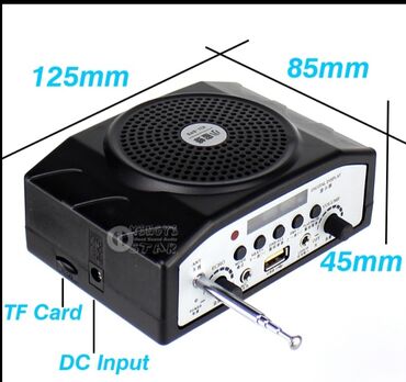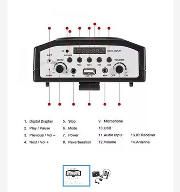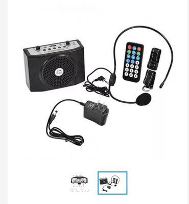 - Kompakt, belə taxıla bilən gücləndirici-dinamik sistemi; üzərində klips və boyun/kəmər üçün qayış ucu.