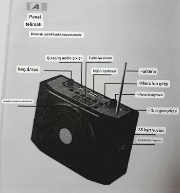 - Giriş-çıxışlar: mikrofon girişi (MIC), qulaqlıq/audio çıxışı, AUX audio input, USB port (MP3/MP4 oxutma və şarj), SD/MicroSD kart yuvası, Micro USB doldurma yuvası.