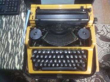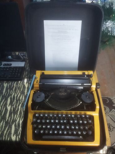 Mexanik yazı maşını – portativ model, sarı korpuslu, qara daşıma çamadanı ilə.