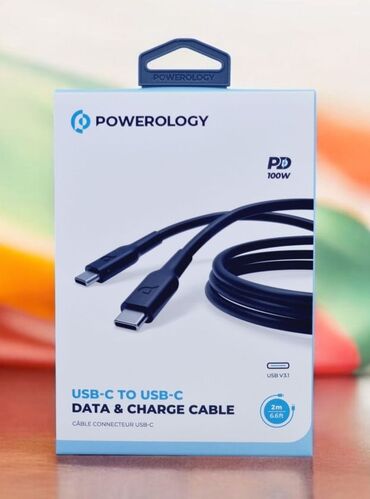 Qutudakı məhsul: 1 ədəd Powerology USB‑C – USB‑C kabeli (2 m, PD 100W, USB 3.1).