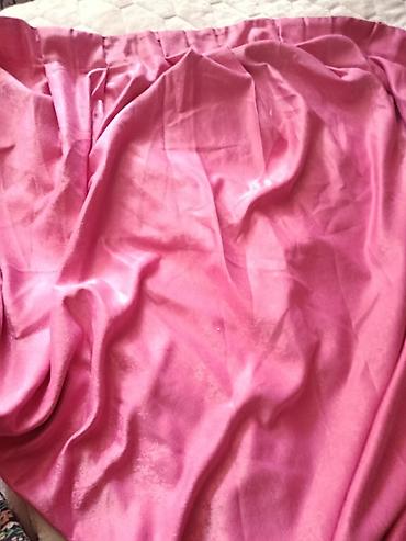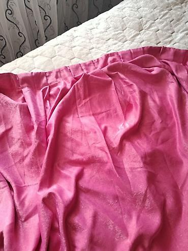 - Qalın pərdə: Parlaq teksturaya malik məxməri-effektli parça, çəhrayı rəng. Üst kənarda büzgü lenti/karniz üçün keçiricilər tikilib. İşığı yaxşı kəsir, tül ilə birgə dekorativ kontrast yaradır.