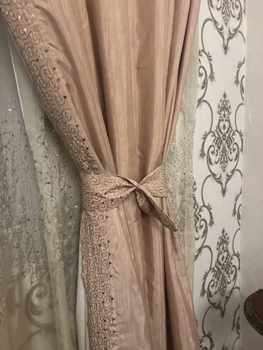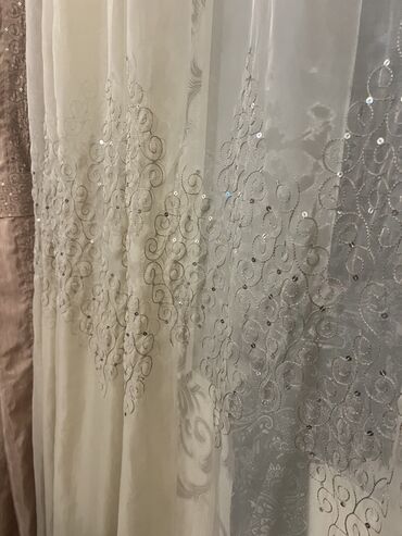 Pəncərəyə asmaq üçün nəzərdə tutulmuş pərdə dəsti. Dəstə iki ədəd bürünc rəngli qalın pərdə və bir ədəd şəffaf tül daxildir. Qalın pərdələrin kənarları və tülün üzəri gümüşü naxışlar və parıltılı hissəciklərlə bəzədilib. Parlaq naxışlar və şəffaf tül otağa zərif görünüş verir. Pərdələr otağa düşən işığı tənzimləmək və məxfiliyi təmin etmək üçün əlverişlidir. Dəst oturma otaqları, yataq otaqları və ya yeməkxanalar üçün uyğundur. Bürünc rəngli pərdələr pəncərənin hər iki tərəfində yerləşir və naxışlı bantlarla bağlanaraq estetik görünüş yaradır. Tül pərdə mərkəzdədir, bu da otağa təbii işığın daxil olmasına imkan verir.