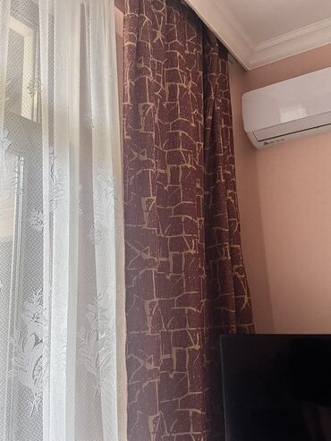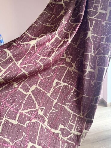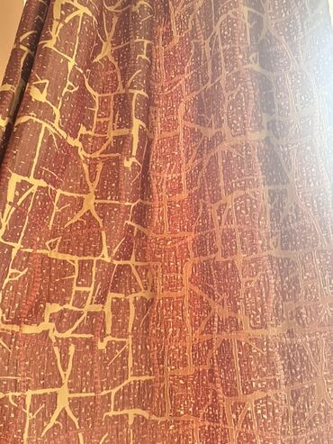 - Qalın pərdə: bənövşəyi-bordo tonlarında, açıq bej-qızılı abstrakt naxışlı. İşığı yaxşı kəsir, otağa zərif parıltı verir. Parça toxuması sıx, yumşaq düşüşlüdür.