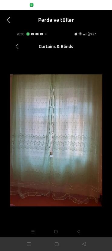 - Model: iki yapraklı tül pərdə, pəncərə ortasından yığmaq üçün lent/bağlama zolağı görünür