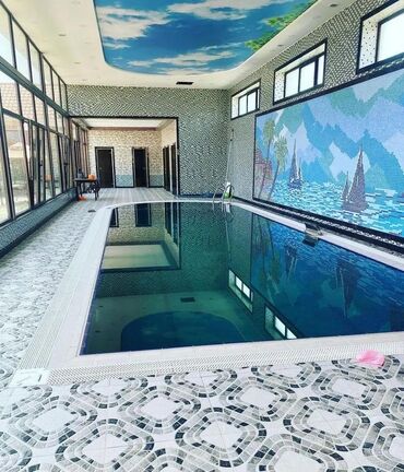 - Panoramik pəncərəli qapalı hovuz, tematik mozaika mural və dartma tavan