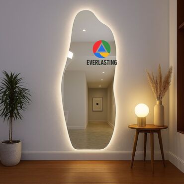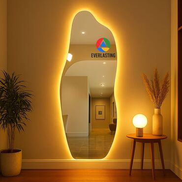 Organik formalı iri divar güzgüsü – LED arxa işıqlanma ilə - Dizayn: sərbəst dalğalı kontur, nazik qara çərçivə; müasir və minimal interyerlərə uyğundur. - Ölçü: tamboy (bütöv fiquru göstərir), də...