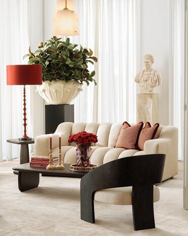 - Dizayn: yumşaq, axarlı xətlər və heykəlsi formalar; neytral krem/bej tonlarında oturma modulları və kreslolar.