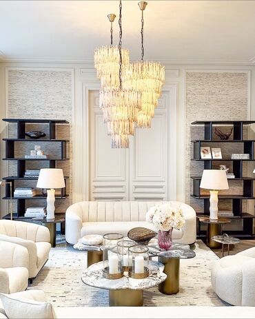 - Dekor aksentləri: rənqli şüşə vazalar, şamdanlar, kitab və heykəltəraşlıq elementləri.
