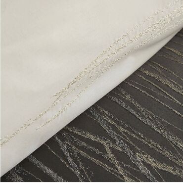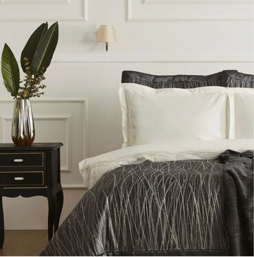 - Duvet/yorğan üzü: qrafit rəngli, atlas parıltılı səth, incə gümüş tonlarında ot-naxışlı işləmə; ətəklərdə hamar atlas bordür.