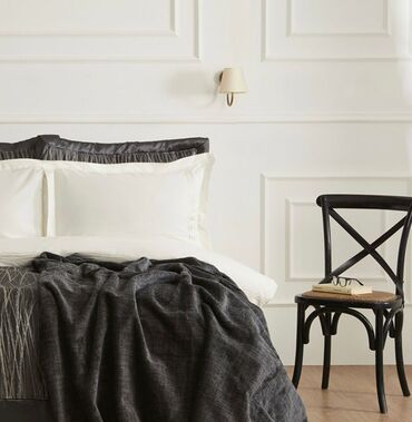 - Uyğun tünd boz pled/örtük: yumşaq, toxumalı faktura, yatağın üzərinə sallanaraq qatlı görünüş yaradır.
