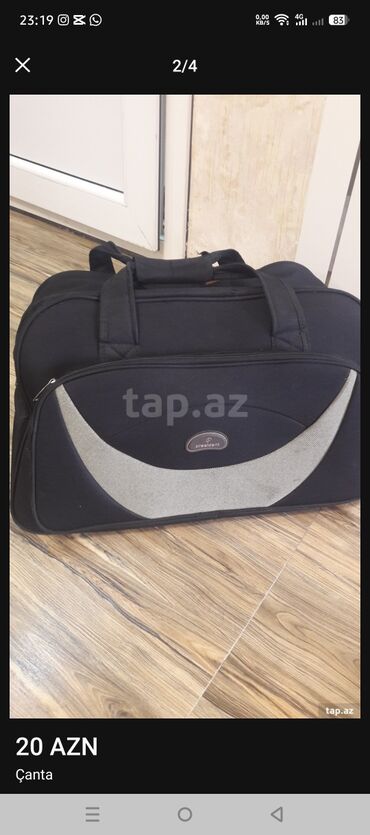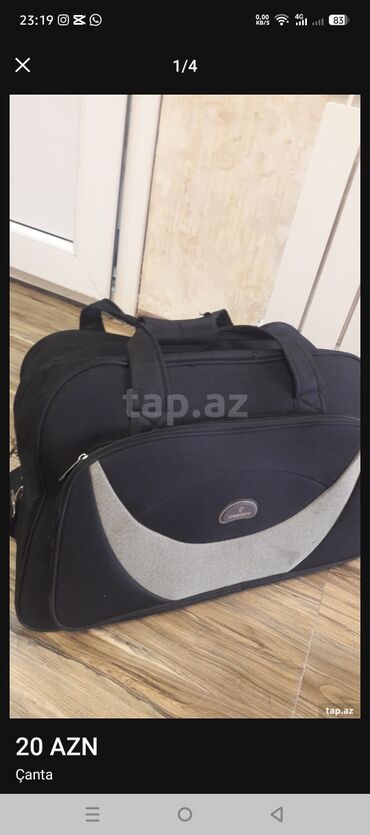 Qara səyahət/idrman çantası - Material: süni dəri görünüşlü, yumşaq və elastik. - Rəng: qara, gümüş rəngli metal (fermuar və tutacaqlar). - Ölçü: iri həcmli (əl yükü və ya qısa səyahətlər üçün uyğ...
