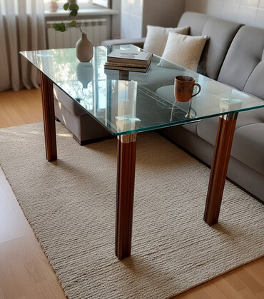 Прочный стеклянный верх с оригинальным дизайном, устойчивые металлические ножки.