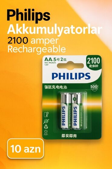Philips AA (HR6/Mignon) şarj olunan akkumulyatorlar – 1.2V, 2100 mAh. 2 ədədlik blister qablaşdırma. Təkrar doldurula bilən (Rechargeable), uzunömürlü istifadə üçün uyğundur. Uşaqların oyuncaqları,...