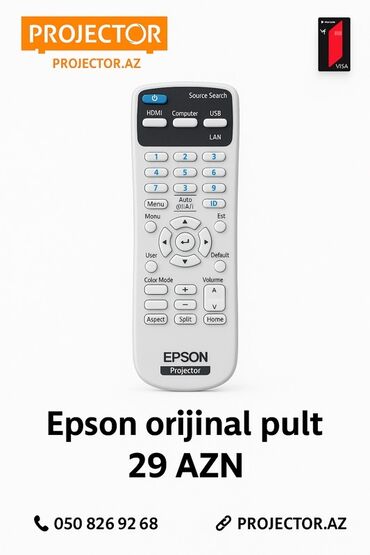 - Epson orijinal proyektor pultu – birbaşa uyğunluq, mənbə seçimi (HDMI/Computer/USB/LAN), rəqəm düymələri, menyu və naviqasiya bloku, səs həcmi, rəng rejimi, Aspect/Split/Home kimi sürətli idarəetmə düymələri. Qiymət: 29 AZN.