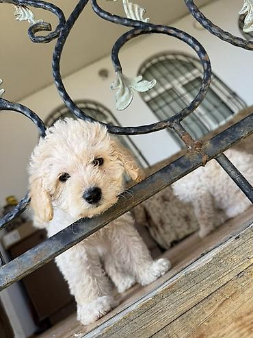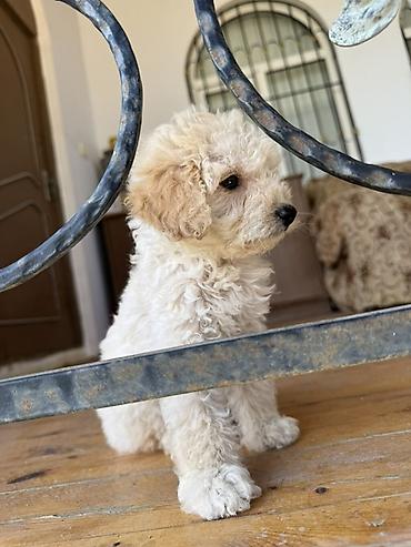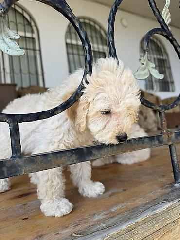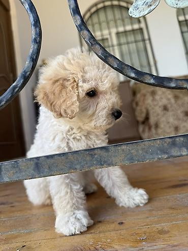 Balaca, ağ-krem rəngli qıvrım tüklü şirin balalar. Cins: pudel tipli (oyuncaq ölçülü görünüş).