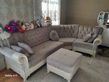 Künc divan dəsti - Tərkib: 1 böyük L formalı künc divan + 1 ədəd geniş kreslo + dekorativ yastıqlar - Rəng: açıq bej (korpus) və boz-bej tonlarda yastıqlar, qızılı detallarla - Material: yumşaq to...