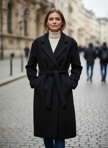 Qadın üçün qara klassik palto - Model: ikiqat düyməli, beldən