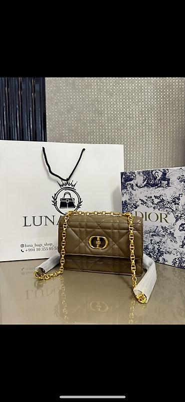 - Dior zəncirli çanta, zeytun-qaşqaldaq rəngi: rombvari tikiş, qızılı “CD” kilid, metal zəncir kəmər. Daxildə əsas bölmə və kiçik ciblər təşkilatlanma üçün rahatdır.