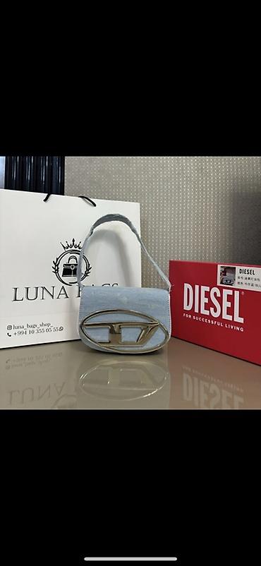 - Diesel denim mini çanta: açıq mavi cins material, iri metal loqo detalı, qısa tutacaqla əlüstü daşıma. Casual geyimlərlə asan uyğunlaşır.