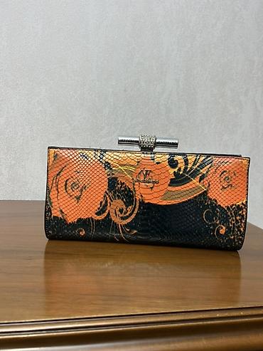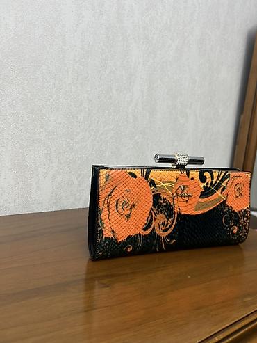 Qadın dəbli axşam çantası (klatç) - Rəng və dizayn: Narıncı-qara rəng palitrası, gül və bədii naxışlarla; ilan dərisi effektli tekstura. - Forma: Uzunsov klatç, sərt karkaslı. - Bağlanma: Metal çu...