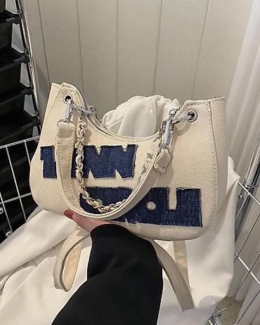 - Model 2: Bej parça çanta – iri mavi denim aplikasiyalar, gümüşü aksesuarlar, zəncir detalı və fermuarlı bölmə. Yüngül və rahat daşıma.
