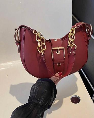 - Model 4: Bordo yarımay çanta – qızılı zəncir və kəmər bəzəyi, tokalı mərkəz detalı, yumru xətlər. Klassik və modern tərzin vəhdəti.