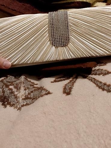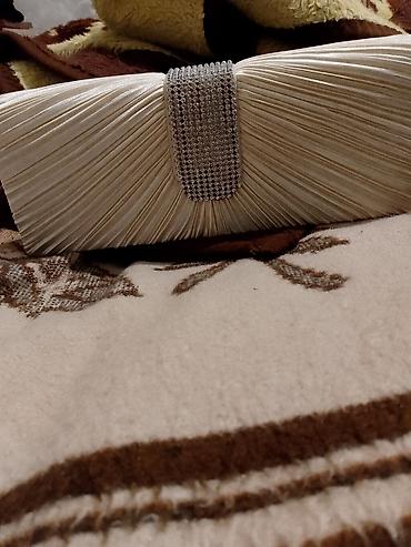 Zərif qadın axşam çantası – krem rəngdə, atlas parıltılı materialdan. Ön hissə büzməli tekstura ilə işlənib, mərkəzdə parlaq kristal daşlarla sıx bəzədilmiş geniş dekorativ zolaq var. Zərif və kompakt ölçü sayəsində mərasim, toy, ziyafət və xüsusi günlər üçün uyğundur. Dodaq boyası, telefon, kart və xırda aksesuarlar üçün ideal tutum. Klassik, şıq dizaynı müxtəlif ziyafət geyimləri ilə asanlıqla uyğunlaşır.